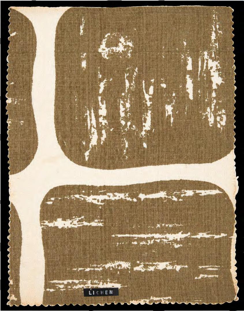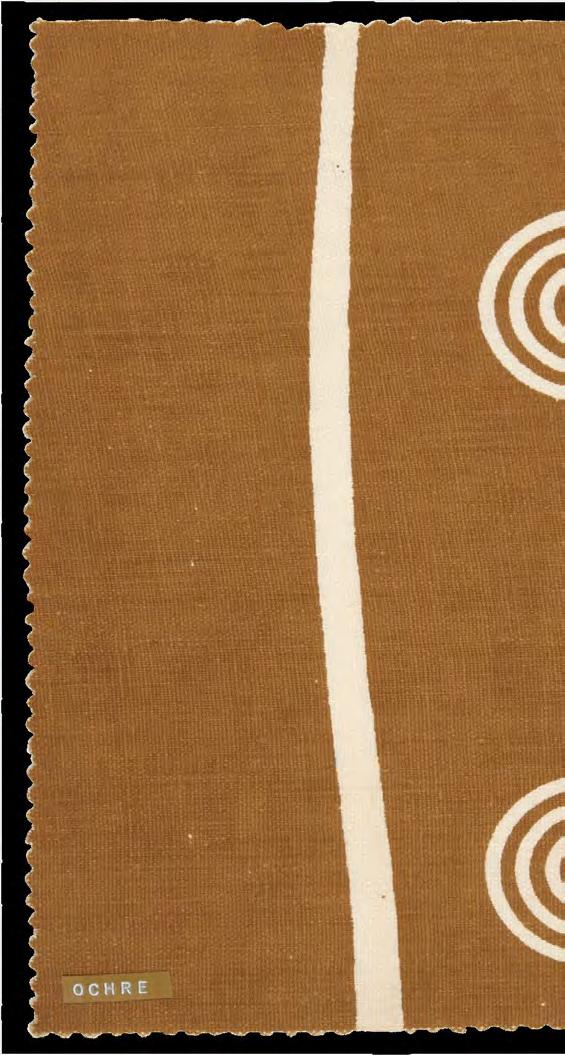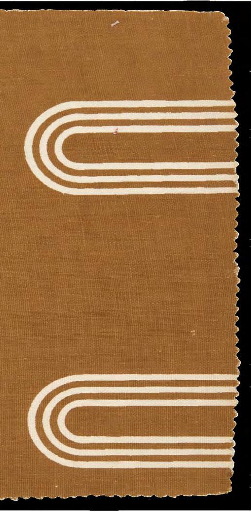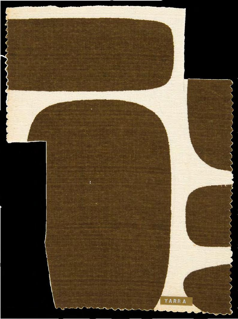 Looking back on the works of many mid twentieth-century designers held in the rda collection, we see different international and local influences at play alongside changing expressions of Australian identity. Alongside colour names (including Ochre, Banksia, Yarra) and designs that reference Australian flora and fauna, landscapes and seascapes, Frances Burke incorporated motifs that were loosely based on Aboriginal art into some textile yardage prints. First Nations-inspired designs were also used for a number of her large-scale commissions, including curtains for the State Library of Victoria’s La Trobe Library, and the Australian Room of the ywca Residence in Taipei, Taiwan.2 While it is unclear who decided to incorporate these references into the spaces, the commissions evidence that textiles were seen to play a role in expressing a sense of national identity at the time.