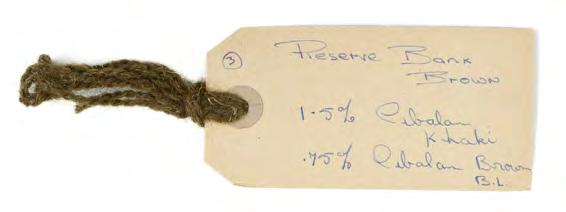 Dyed brown wool yarn attached to cardboard tag titled ‘Reserve Bank Brown’, creator eclarté. Gift of Elizabeth Hill 2017.