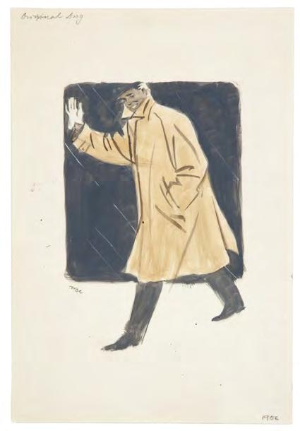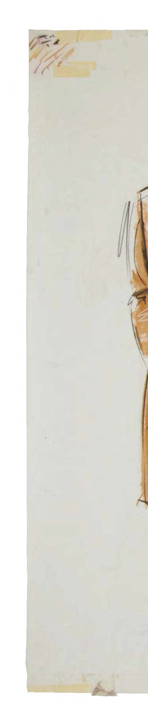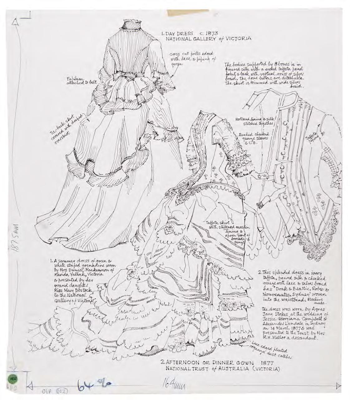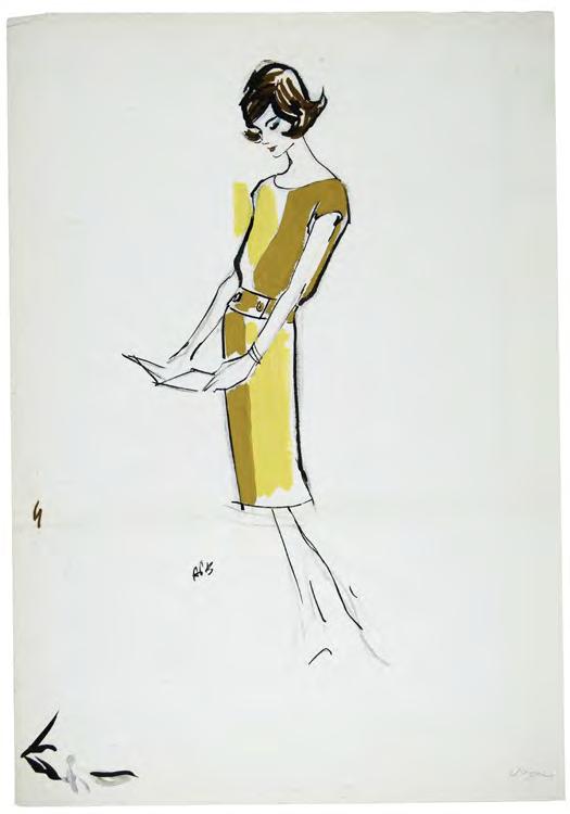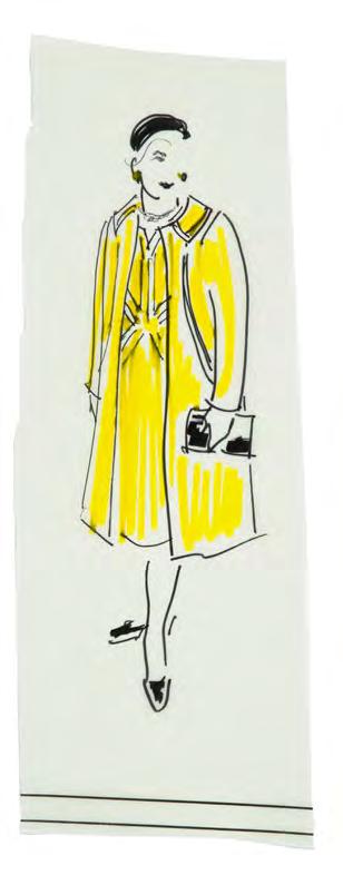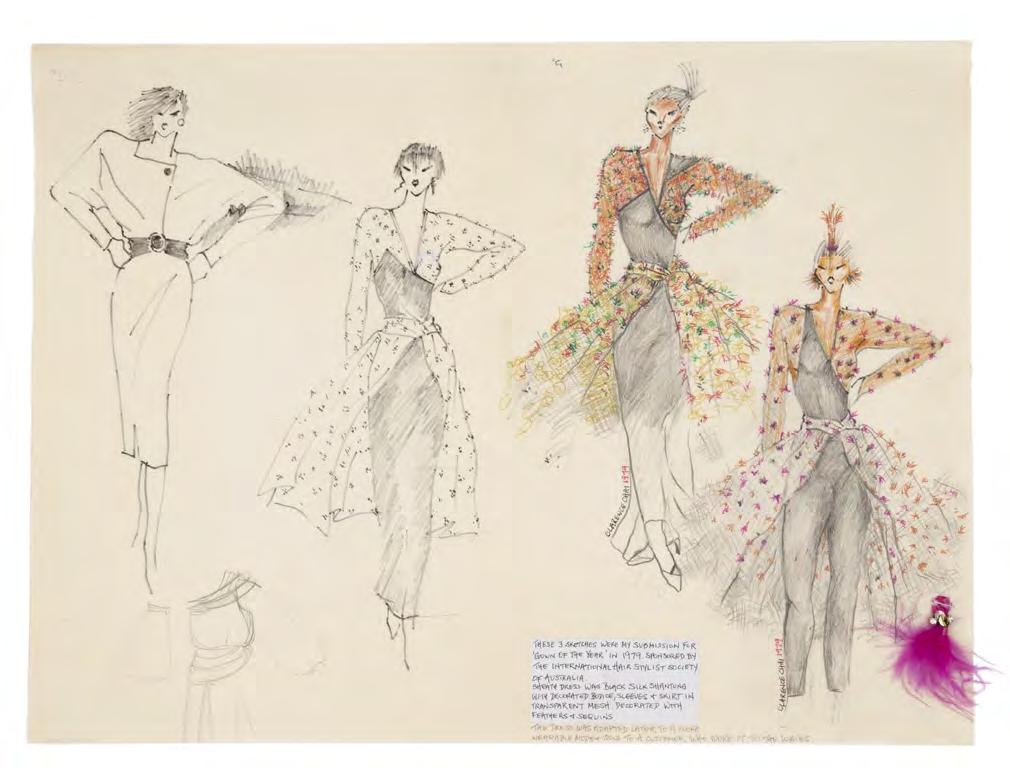 Illustration is both a process, of sketching for ideation, and outcome of fashion design, serving to exemplify the character of a garment, advertise fit, movement and space or explain technique, construction and context. Louis Kahan’s 1956 advertisement for the German firm of Niehues & Dütting focusses attention on the man’s trench coat by highlighting it against a black background and labelling the “self-ventilating” Nino Flex material in the published version. By contrast, Alfredo Bouret’s illustration clearly advertises the beachside location of Torquay for Jaeger’s New Fashion House in the United Kingdom. Clarence Chai’s three sketches for The Gown of the Year in 1979 show a transformation from restrained daywear to an exuberant gown decorated with feathers (including sample) and sequins. The drawing is also annotated with a note about its adaptation to “a more wearable mode” for a client who wore it to the Australian television Logie Awards. Diane Masters’ illustrations are perhaps the most remarkable for their explanatory capacity in terms of attention to fashion history and her work as an archivist and curator. Her insider perspective as a high fashion model, who modelled Hall Ludlow’s Gown of the Year in 1959, is revealed in her meticulous attention to detail in her notes for the 2005 Dressed to the Eyes: Fashion Designs by Hall Ludlow exhibition at the rmit Gallery, as well as her informally elegant 2007 sketch of Frances Burke in her yellow Magg dress and coat.