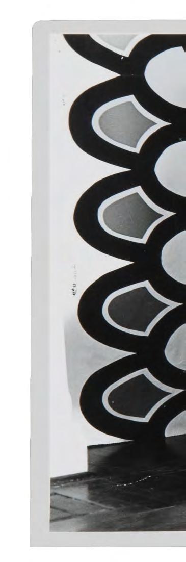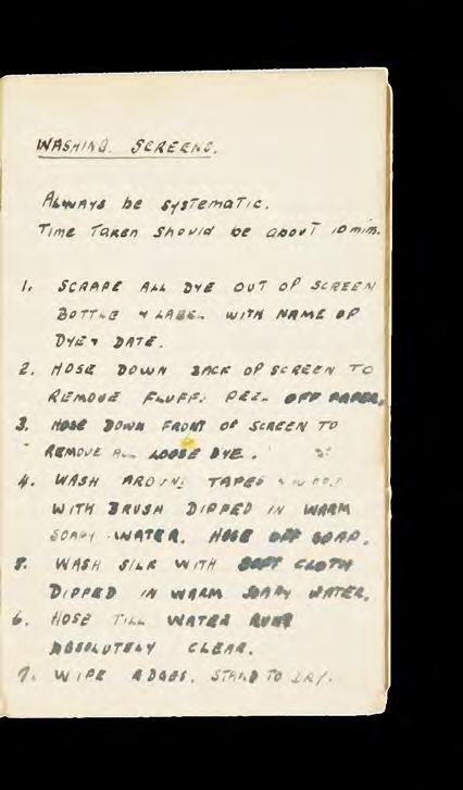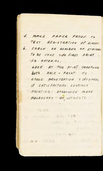 textile technologies, choosing to upgrade studio processes from lino print to silk screen printing to better support commercial high yardage textiles for domestic interiors and architectural-scale commissions. The rda collection includes detailed journals and colour swatches that show the ongoing development and testing of new dye recipes and printing processes in Burke’s businesses, as well as her advocacy for textiles to be identified as a design discipline.1 Alongside other post-war textile archives (including eclarté and Gloweave), items in the Frances Burke collection show the impacts of the post-war industrial manufacturing technologies boom in Australia. Viewed together, these archives spark conversation about the nature of craft and design, and highlight the transition of textiles and printing practice in Melbourne from a cottage industry to a design profession.