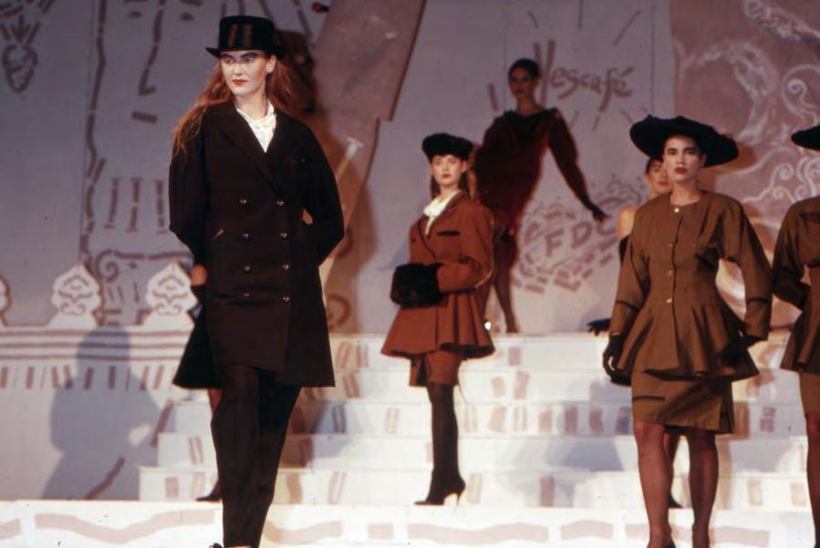 patterns are put in sharp relief on a rocky seashore. Diane Masters also recalled the challenging locations preferred by photographer Athol Shmith who sought out demolition sites: “They’d put us on a great heap of stone and rubbish and we’d have to balance on our high heels.”8 The sheep pen at the Royal Melbourne Show and the atmospheric medieval architecture of the Monsalvat artist community provide contrasting locations for Prue Acton photo shoots in the late 1960s, in turn speaking to natural fibre production and counter-cultural movements. Other iconic locations are the Crystal Ballroom in St Kilda for the Fashion 83 parade, and the Melbourne City Baths for the Substance of Dreams launch in 2003.
