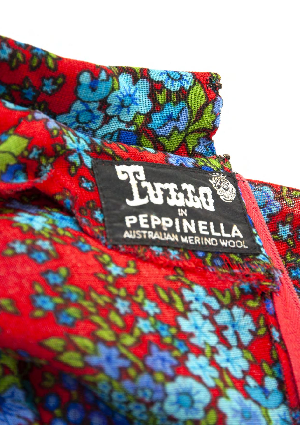 Label for ‘Tullo in Peppinella Australian Merino Wool,’ on women’s floral print dress, 1973-1977, designer Norma Tullo. Donated by the National Textile Museum of Australia 1994.