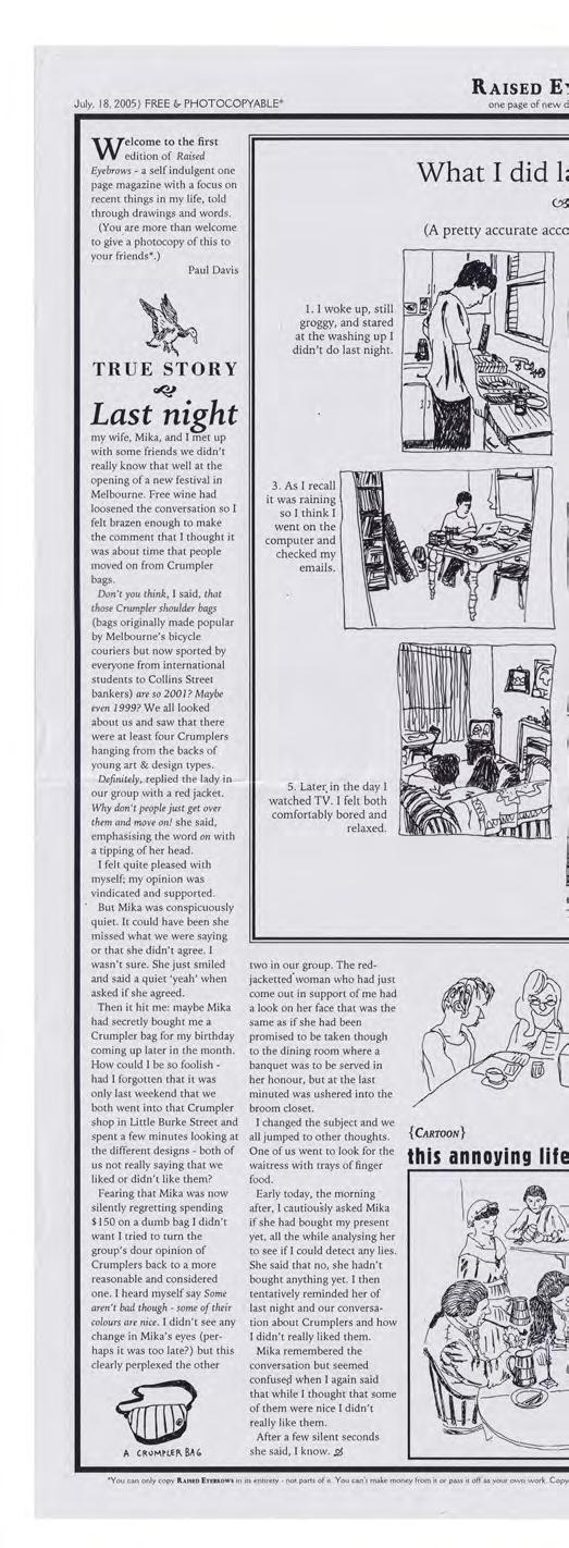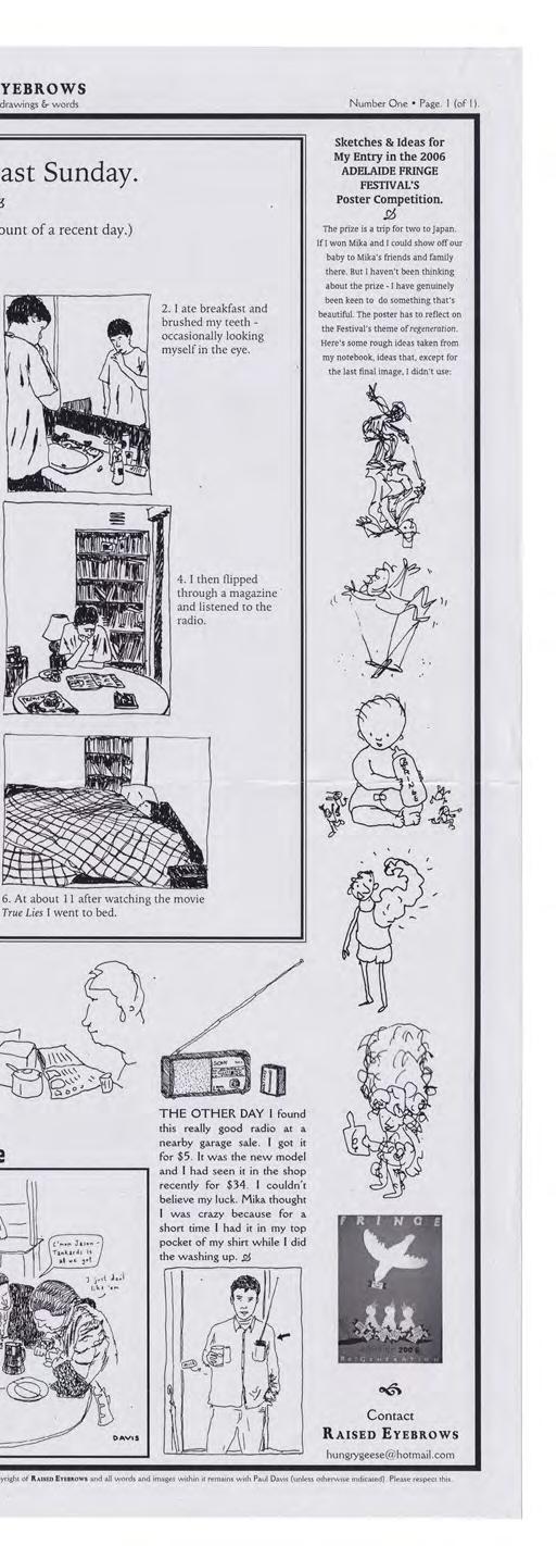 Upon returning to Australia in 2004 I began making Raised Eyebrows, a printed thing I proclaimed as “Melbourne’s only single-sided A3 magazine of cartoons.” I offered it for free at Sticky’s Degraves Street subway store and at a couple their zine fairs. In an effort to get it in front of more peoples’ eyeballs, I openly encouraged everyone to photocopy and distribute it. The point of Raised Eyebrows was to showcase my funny little drawings in a publishing context reflective of mainstream media. My drawings sat alongside short articles (that I also wrote) in such a way that a newspaper editor might see their potential, their publishability. It paid off: In 2005 I was commissioned to draw a handful of editorial cartoons for The Age, and in 2007 the paper started publishing my weekly cartoon Overheard in their Sunday edition.
