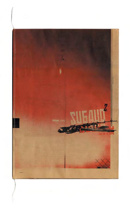 sewn. These constraints allowed me to push the parameters, working around the limitations to continue forming the book. For example, the development of the editorial approach was determined by section sewing. Images and interviews were placed according to eight-page signatures to differentiate between images and text. I wanted the interviews to mirror bureaucratic documentation by selecting a light blue paper stock. This paper was to then be wrapped around these signatures resulting in their placement at pages 9–12, 21–24, 33–36, and 45–48. The placement of the pages allowed for natural chapters to form through the constraints of the printing and binding process. This required extensive troubleshooting, but it gave me a deeper understanding of the printing process and possibilities for future projects.