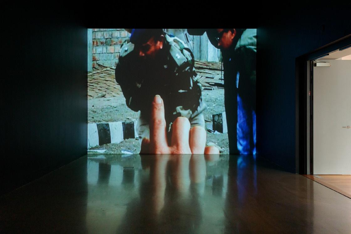 Like Schmid and several other artists in this exhibition, Swiss artist Thomas Hirschhorn often works with images found, or rather sourced, from the context of the internet. In Touching Reality (2012), a large-scale video projection, a hand scrolls idly through photographs of burnt, mangled and bloody bodies on an iPad touch screen, occasionally pausing to zoom in for more detail. In the gap between seeing and touching, the apparent calmness of the well-manicured white hand acts in striking contrast to the extreme images of violence of “undefined provenance” sourced from the recesses of the internet in the context of the so-called ‘war on terror’ in Iraq. Just as the bodies are anonymous, we do not see the face of the viewer guiding us, nor do we know their motivation; we are simply made complicit with what seems to be a casual act of visual grazing. The images, mostly created by amateurs in the surrounding crowd on their phones, look back in the sense that they call on us to take ethical responsibility for our viewing them. Photographs sourced on the internet are thus recast in a complex event of spectatorship emblematic of contemporary photographic culture more generally – involving subjects and onlookers in the photographs, various photographic authors, the viewer using the touchscreen in the video, Hirschhorn the artist, and us, the eventual viewers of the artwork.