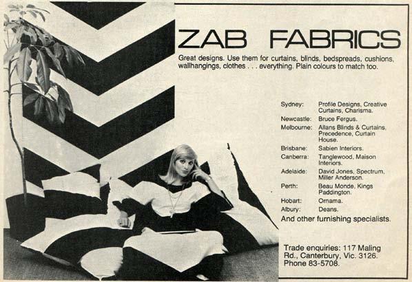 Advertisement for Zab fabrics, Australian Home Journal, June 1975, 65.