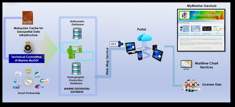 infrastructure for the exchange of geospatial information. The development of the marine economy, the expansion of maritime business and the preservation of the environment depend on the availability of high-quality, correctly maintained Marine SDI data. Consequently, MyGDI established a Marine Technical Committee, of which NHC oversees the Marine SDI.