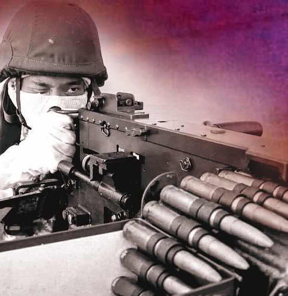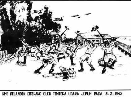 An artist impression depicting Malay Navy sailors defending HMS PELANDOK from a Japanese air raid