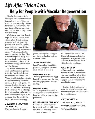 Life After Vision Loss: Help for People with Macular Degeneration Macular degeneration is the leading cause of severe vision loss in people over age 60. It occurs when the small central portion of the retina, known as the macula, deteriorates. Macular degeneration can be a source of significant visual disability. While there is no cure, there is hope. Dr. Robert Stamm, a low vision optometrist, is utilizing telescopic technology to help patients with macular degeneration and other vision limiting conditions, literally see the world again. “Patients are often told nothing more can be done. This is debilitating news. Many doctors are simply not familiar with the recent advancements in low vision technology. There is hope,” says Dr. Stamm. Dr. Stamm is one of only 32 doctors in the country specially trained and credentialed by the International Academy of Low Vision Specialists, to help patients with vision-limiting conditions see more clearly with special low vision technology. Libbie Schroeder, one of Dr.Stamm’s successfully treated patients, states, “I thought I was going to lose my license, but now I can still drive myself to the store and Church,” all with the help of low vision technology. ADVANCES IN LOW VISION TECHNOLOGY Once used primarily by sur-