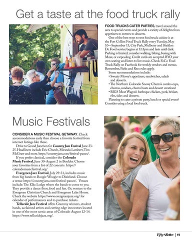 Music Festivals CONSIDER A MUSIC FESTIVAL GETAWAY. Check accommodations early then choose a favorite festival from internet listings like these. Drive to Grand Junction for Country Jam Festival June 2325. Headliners include Eric Church, Miranda Lambert, Tim McGraw and more. https://countryjam.com/festival-passes/. If you prefer classical, consider the Colorado Music Festival, June 30-August 2 in Boulder. Choose your favorites from a list of 22 concerts. https:// coloradomusicfestival.org/ Evergreen Jazz Festival, July 29-31, includes music from big bands to Boogie Woogie to Dixieland. Choose a venue https://countryjam.com/festival-passes/. Venues include: The Elks Lodge where the bands to come to you. They provide a dance floor, food and fun. Or, venture to the Evergreen Christian Church and Evergreen Lake House. Check the website https://www.evergreenjazz.org/ for calendar of performances and to purchase tickets. Telluride Jazz Festival offers Grammy winners, student bands, acclaimed artists and cutting edge innovators located in one of the most scenic areas of Colorado August 12-14. https://www.telluridejazz.org/.