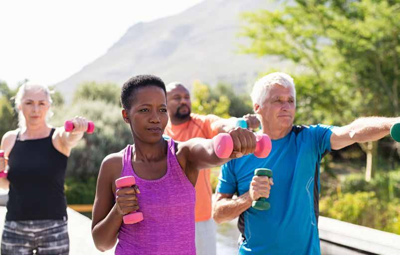 AS WE AGE, MAINTAINING MUSCLE MASS is less about looking buff than it is about being healthy. The benefits of hitting the gym are even more important as we age. If we maintain muscle mass and cardiovascular health into our 50s, 60s and 70s, we get a huge payoff—the ability to continue to do things we love without fear of injury or losing our balance. Our bodies look and feel younger, and we are more able to easily move around out in the world and at home. Aim for two to three weight training sessions a week, even if it’s just dumbbells or resistance exercises on a mat at home. Also try to fit in at least 150 minutes of moderate cardiovascular exercise a week, or 75 minutes of vigorous activity a week, according to the Mayo Clinic. Don’t forget to stretch. Stretching helps maintain flexibility and range of motion, increasing circulation and blood flow.