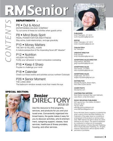 ROCKY MOUNTAIN PUBLISHING 825 Laporte Ave., Fort Collins, CO 80521 Voice 221-9210 Fax 221-8556 editor@rockymountainpub.com www.RMParentMagazine.com Rocky Mountain Senior magazine is published five times a year by Rocky Mountain Publishing, Inc. Publication of this paper does not constitute an endorsement of the products or services advertised. RMP reserves the right to refuse any advertisement for any reason. The opinions expressed by contributors or writers do not necessarily reflect the opinions of Rocky Mountain Publishing. ©2012 Rocky Mountain Publishing, Inc. All rights reserved. Reproduction without express written permission is prohibited.