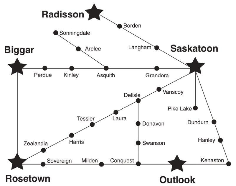 Milden, Outlook, Perdue, Pike Lake, Sonningdale, Sovereign, Swanson, Tessier, Vanscoy, Zealandia
