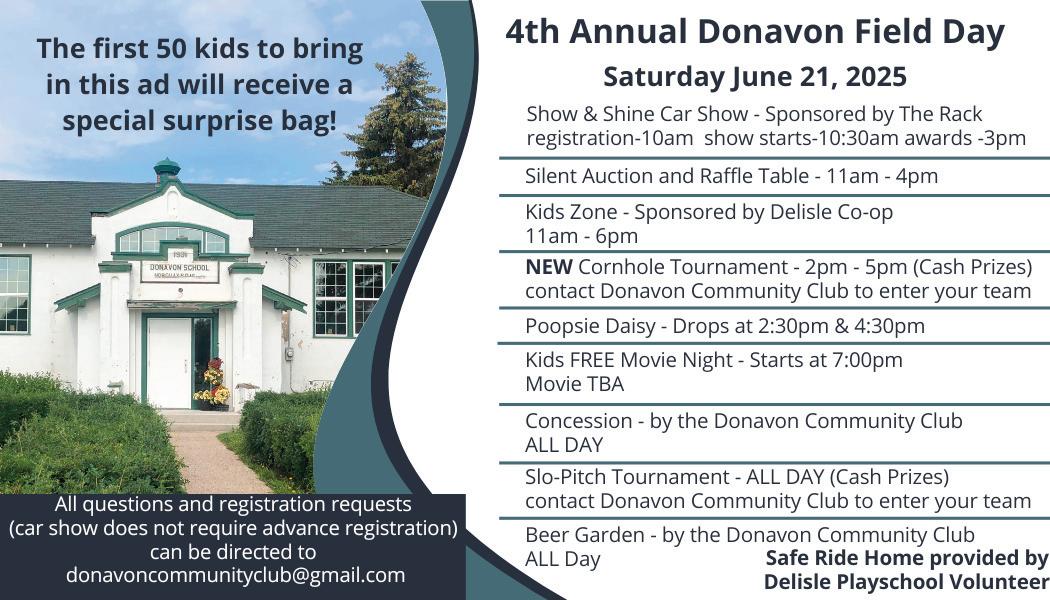 he 4th Annual Donavon Field Day is happening on June 21st at Montrose Community Centre (Donavon School). It is bigger, better, and more family-friendly than ever! So get ready for a full day of fun, laughter, and community spirit!