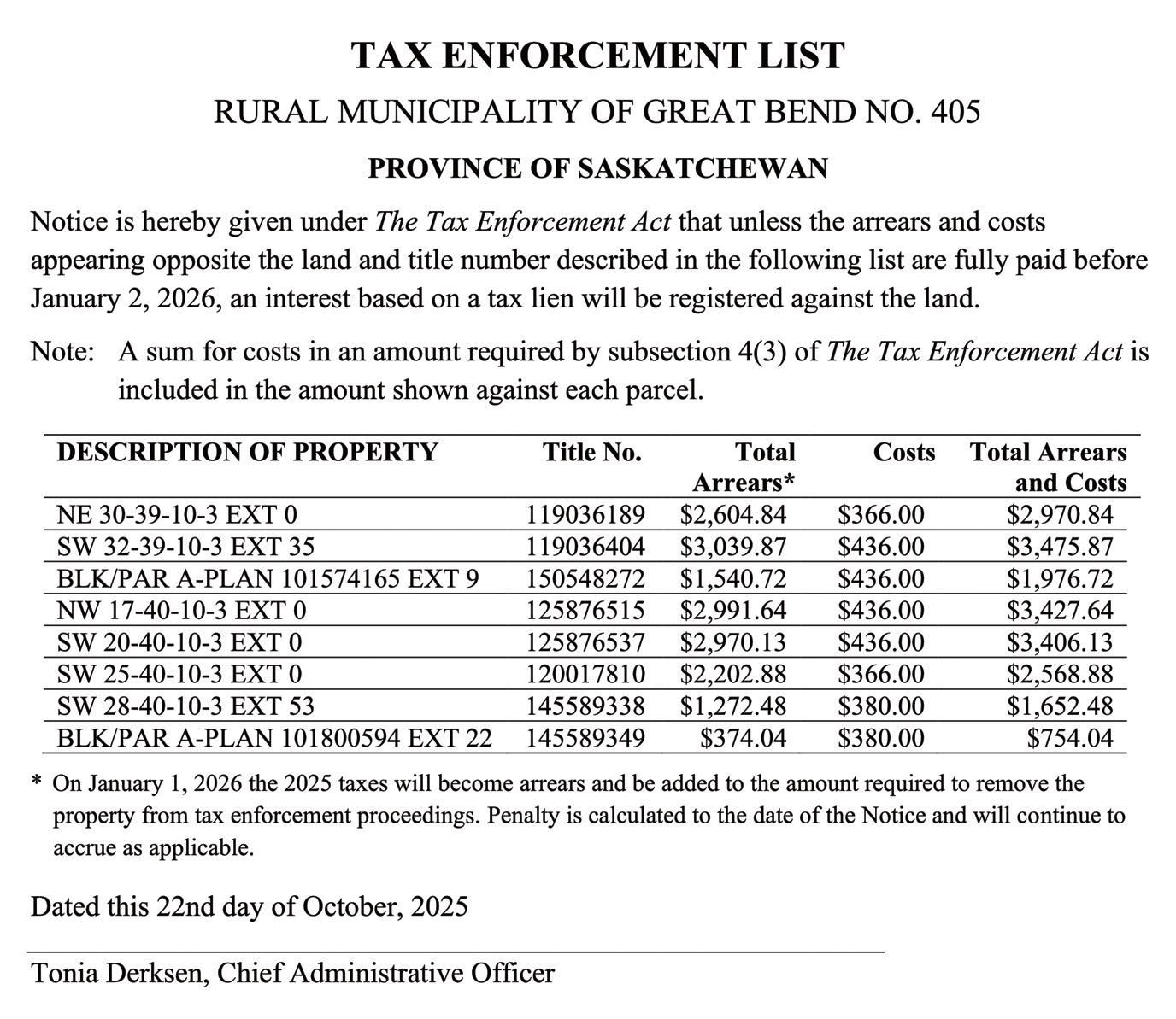 Notice is hereby given under The Tax Enforcement Act that unless the arrears and costs appearing opposite the land described in the following list are fully paid before the 31st day of December 2025, a tax lien will be registered against the land.