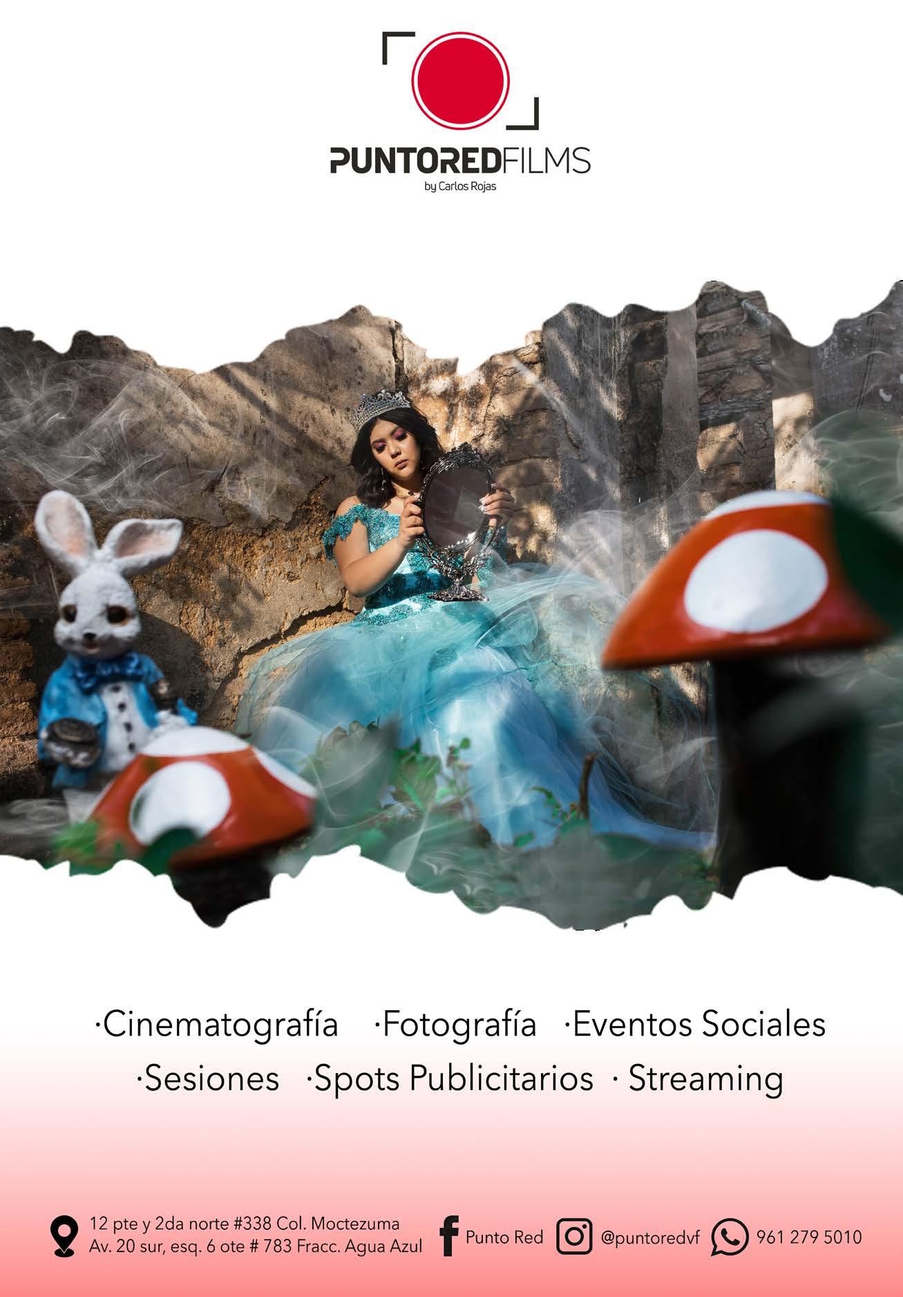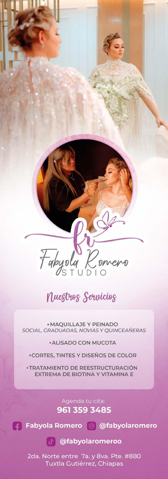 MAQUILLAJE: Carlos Meza: 961 282 0039, Eloisa Gómez: 961 126 5154, Iván Aguilar: 961 638 0422, Carlos Castillo: 961 115 0811 Fabyola Romero: 961 359 3485, Kathia Cruz: 961 262 9311. EVENTOS SOCIALES: Darío Delgado.