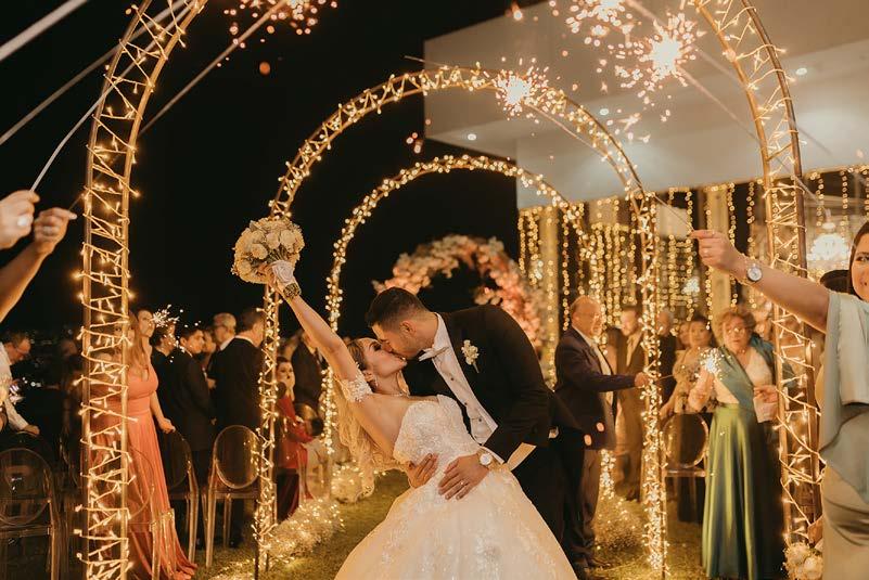 Los recién casados se trasladaron a Glück Espacios, donde compartieron su felicidad con sus invitados en una agradable recepción, disfrutando de una velada de baile y música en un ambiente de ensueño gracias a su wedding planner Leo Palacios, quien también hizo posible encontrar el vestido que Carolina soñó con la marca Apparel Novias By Damián Ordóñez.