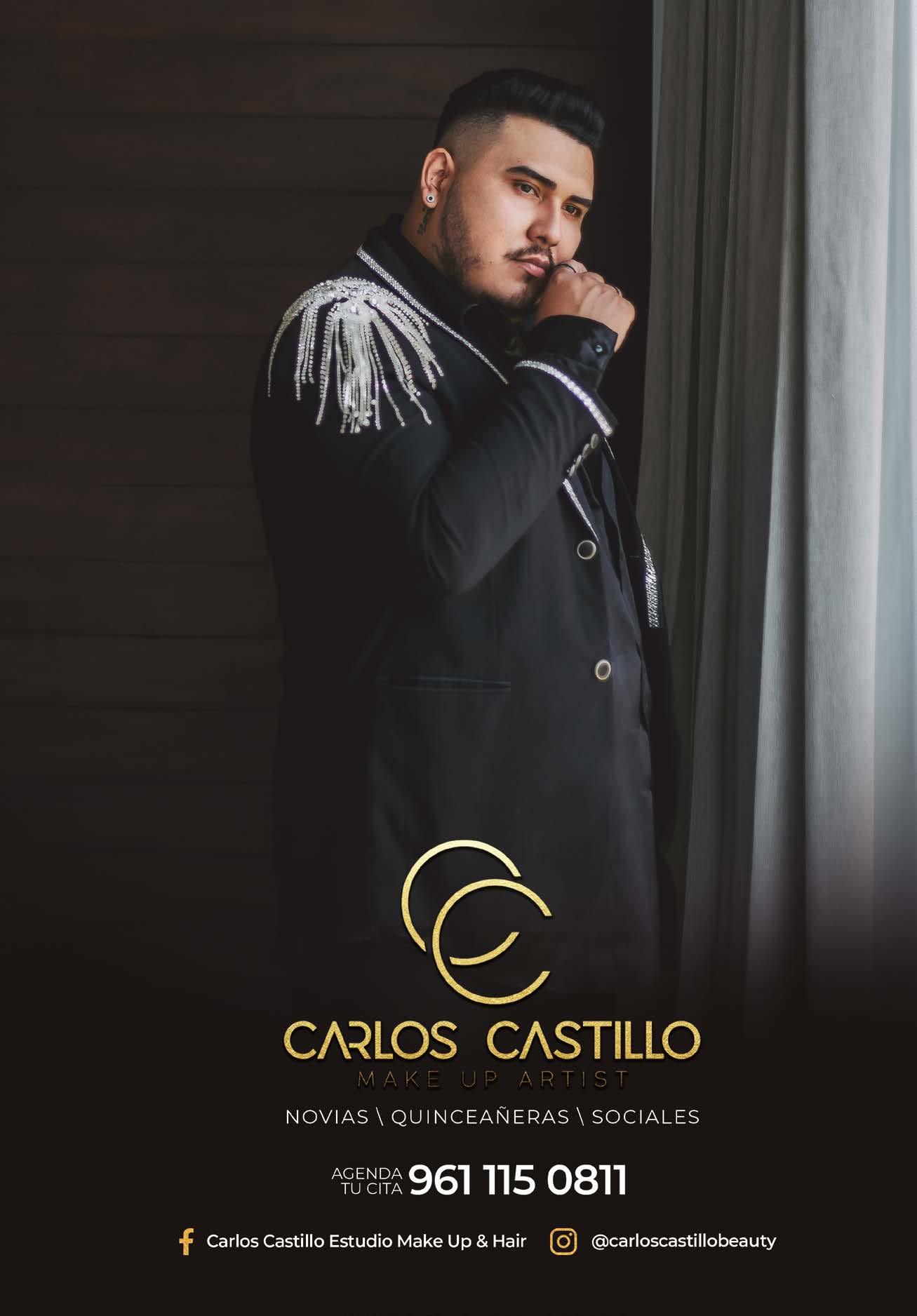 Ha maquillado a modelos, reinas de belleza y artistas reconocidas, Carlos Castillo se destaca en el mundo del maquillaje por su talento. Su habilidad de crear desde looks elegantes hasta atrevidos lo ha situado como uno de los makeup artists preferidos de Chiapas. Su experiencia es amplia, sobre todo en el campo editorial, puesto que ha colaborado en diversas producciones y muchas de ellas para esta editorial. Esta ocasión no es la excepción, puesto que él es quien cuida la imagen de los embajadores de Chiapas.