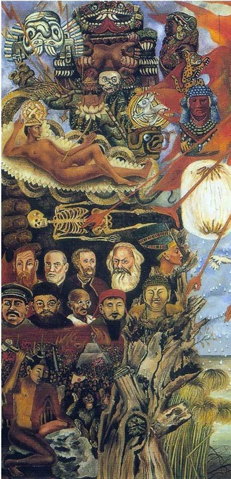La obra se llama El núcleo de la creación, también conocida como Moisés por su conexión con el libro de Sigmund Freud. El punto central es un bebé por nacer. Se desprenden unas gotas de vida sobre un Moisés en canastilla con el rostro de Diego Rivera, infante con el místico tercer ojo en la frente. La parte superior central está invadida por la inmensa representación del dios Atón en forma de sol con rayos que acaban en manos, tal y como aparecen labrados en un altar de piedra que se encuentra en el Museo Egipcio de Berlín. Atón no puede ser representado con figura humana o figura animal. Es un círculo divino que derrama energía y vida sobre Egipto.
