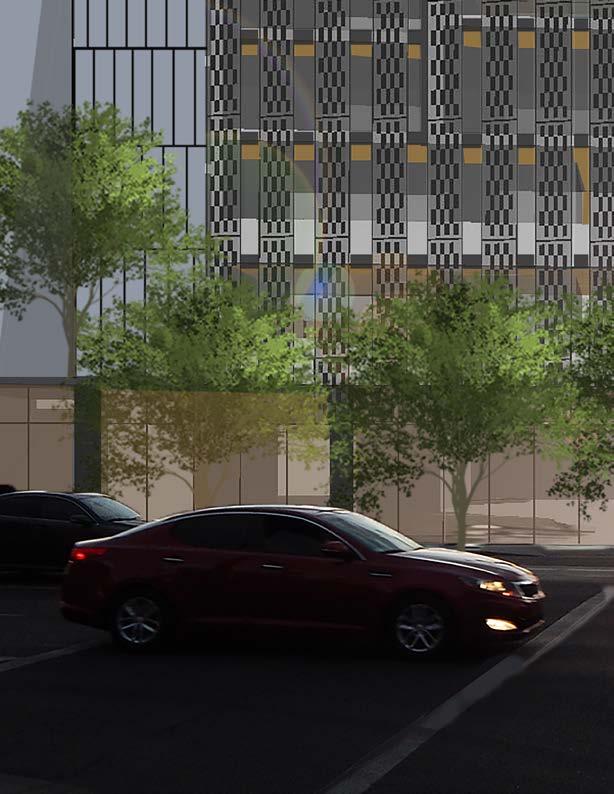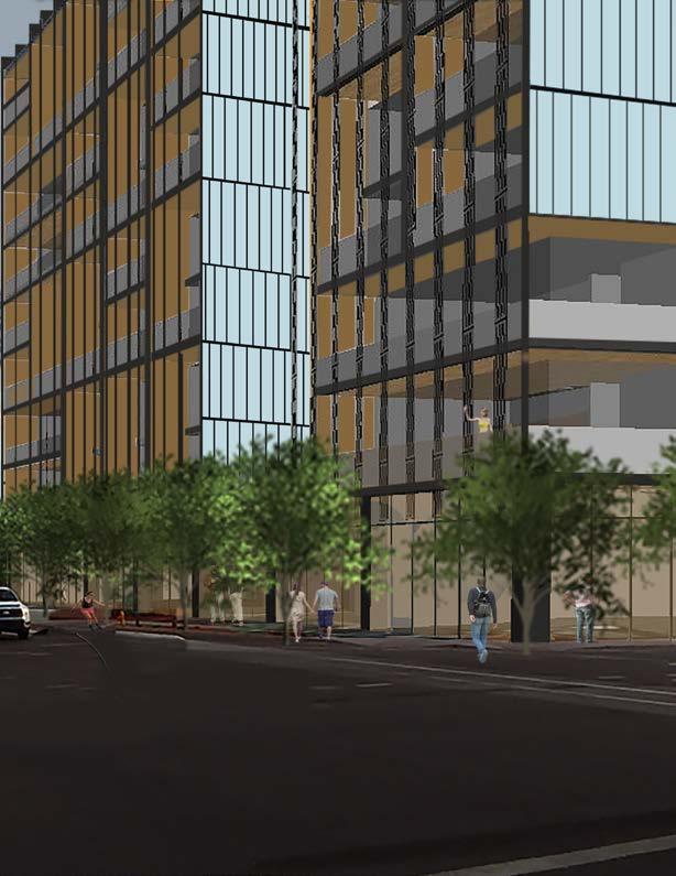 Entrances off of each major street bring the cars down two stories; parking for retail patrons is located on the ground floor behind each retail establishment. These entrances are also accessed from either major street.