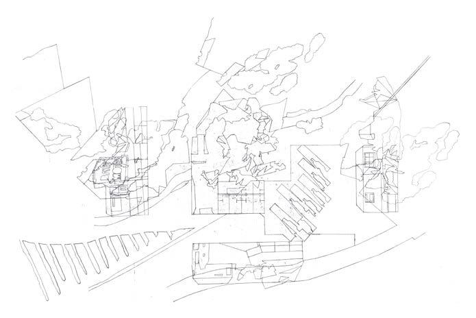 The above portrays portions of the circulation through the plots (green) and the ages (red and blue.) The lines and gestures observed in this image are directly related to the completed site plan.