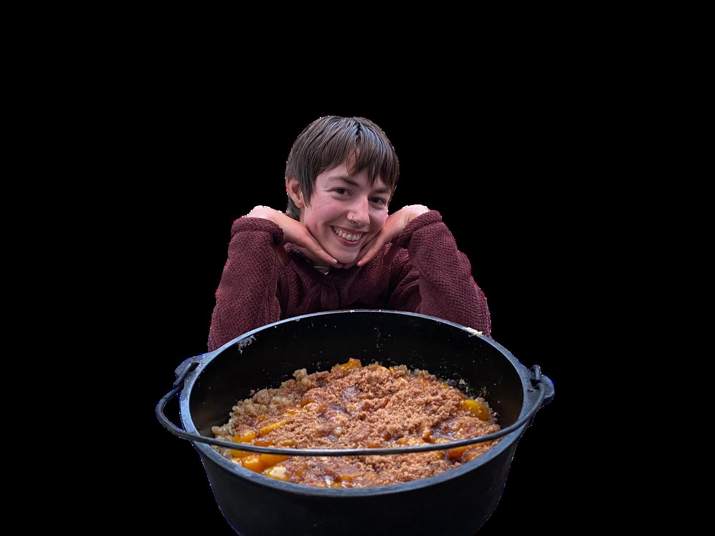 Preheat Dutch oven over 28 coals. Knead warmed butter and cake mix in zip up bag till you see crumbles Remove Dutch oven from heat and add peaches with liquid and return to heat Simmer till the liquid is steaming and you start to see bubbles The fruit and liquid need to be almost boiling before you add the crumble mix Sprinkle the crumble mix from the bag evenly over the fruit Do not stir Bake 25 45 minutes or until lightly browned on top (Serves 8 10 people