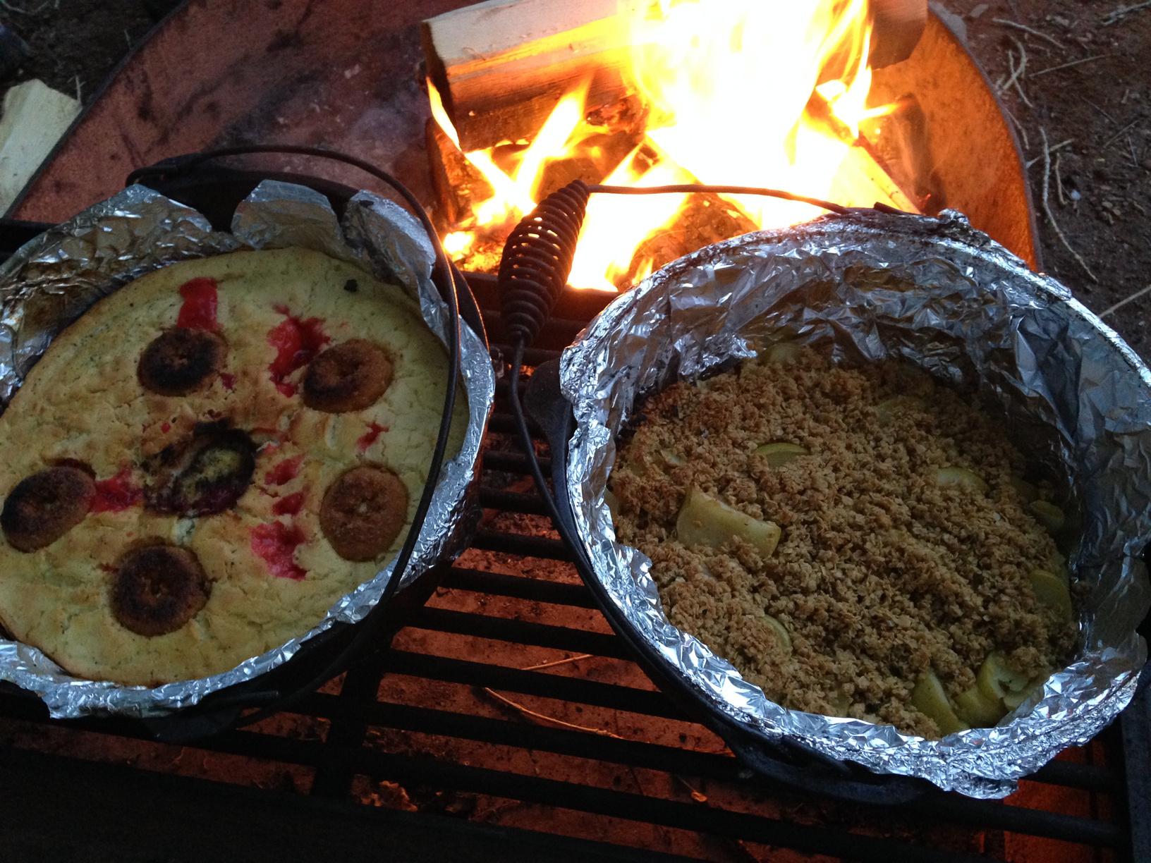 Mix together the first four ingredients and water Roll out on a floured surface, adding more flour to make the dough less sticky if necessary Mix butter, brown sugar, and cinnamon until creamy and spread it on the dough Sprinkle with nuts and raisins if desired Roll up jelly style, pinching dough closed so the sugar doesn’t fall out Slice roll into 1 inch slices and place in a lidded pan or Dutch oven Cover and bake, using twiggy fire on top of the lid, for 15 25 minutes Makes 12 rolls