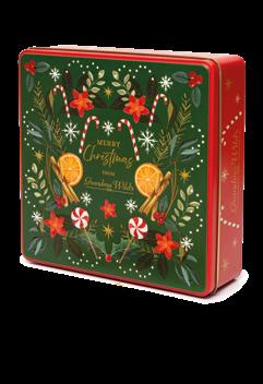 Double chocolate chip, stem ginger & lemon, chocolate chip, crumbly oat, Viennese, and fruit and lemon biscuits, presented in an embossed tin. 400g. 18.5 x 24.5 x 6.5cm