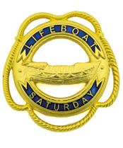 A replica of a heritage badge, with an intricate rope design surrounding a lifering with Lifeboat Saturday wording and a lifeboat. Gold-coloured metal with blue enamel details. Pin back. 4 x 4cm