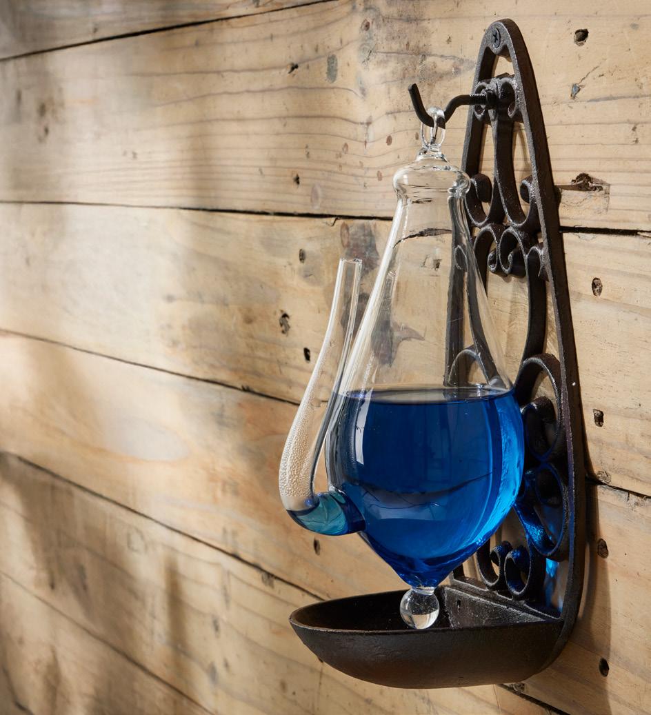 Observe and forecast weather conditions. Water level rises and falls depending on atmospheric pressure. For outside use. Includes glass vessel with cast iron base, syringe and blue colour pigment. 14 x 12 x 27.7cm. €