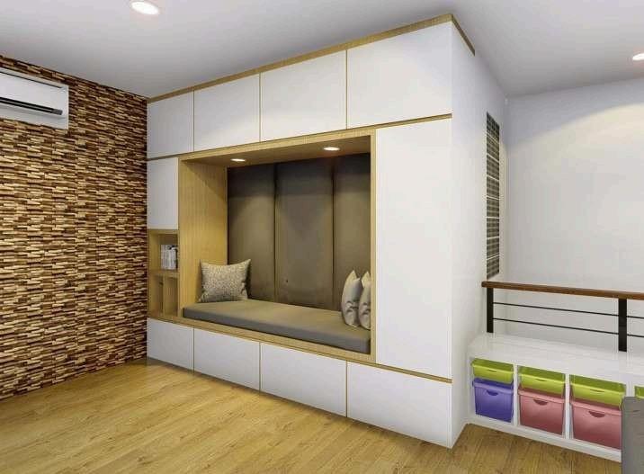 The client has two small children and requires a lot of toy storage in the living room area on the 2nd floor. The client requests a messy family room to be made as a TV backdrop and an additional lower cabinet for the vacuum robot to make it look more closed. the existing credenza is combined with cabinets and panels. The client also wants to have a bar table that can be folded and can store wine bottles in his cabinet