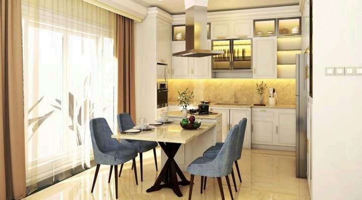 Kitchens with unique lighting decorations add to the lively atmosphere of a warm kitchen. The elegant appearance with the broken white color concept is equipped with a kitchen island and a matching dining table to make the kitchen more comfortable. The letter Lshaped kitchen that utilizes the corner of the room with storage cabinets installed at the bottom and top is used to store kitchen utensils, so that the kitchen still looks clean and tidy