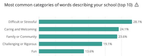 So we dive into our data, right? We’ve done the survey, the Challenge Success Research Team has seen the data, and they are presenting it to us in infographics. Now, we have to dig into it and see what the data actually says - and it says a lot. It says we’re working too hard, and we’re all stressed out. Nearly 30% of the student body says the words they would use to describe RNS are “Stressful or Difficult.”