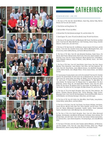 GATHERINGS REUNION WEEKEND | JUNE 2014 1. The Class of '94, from left, Harold Williams, Dawn King, Andrew Tidby, Martine Renaud, Dan Frye and Julie Cloutier. 2. Paul Kitchen and Doug Bannon '39. 3. Bertram Miller '44 and Joan Miller. 11