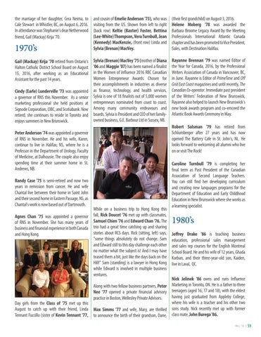 (their first grandchild) on August 3, 2016. Helene Moberg '78 was awarded the Barbara Broome Legacy Award by the Meeting Professionals International Atlantic Canada chapter and has been promoted to Vice President, Sales, with Destination Halifax.