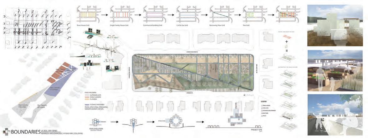 site explores human-scaled movements to connect Downtown Los Angeles using micromobility and micro lanes to allow for a more personal experience and interaction of the city. MULTI-USE GREEN SPACE MULTI-USE SPACE BUILDING MICRO LANE S ALAMEDA ST COMMUNITY GARDEN N 10 02030 USING MICRO LANES Pistacia chinensis SHADE TREE Cercidium floridum STREET TREE Cercidium Desert Museum’ SMALL TREE Muhlenbergia rigens GRASS Melaleuca quinquenervia Buchloe dactyloides 'UC Verde' PLANTING S ALAMEDA AVE CENTER ST LEGEND MOBILITY LANES PEDESTRIAN MULTI-USE GREEN SPACE MICRO LANE DISCONTINUED TRAIN TRACK EDGE CONDITION GREEN WALL GATE AMENITIES MULTI-USE SPACE BUILDING BUS STOP REST STATIONS STREET TREE PLANTING RAISED PLANTERS BUILDING N 50 0100200 GATHERING ON THE EDGE Corridorformicromovements GOING MICRO ARACELY FONSECA IDA LI| PROFESSOR SENES LA 2111L FALL 2019 Human scaled spaces that allows for connections through stagnant and dynamic movements CREATING MICRO SPACES N 5000 10002000 EXPANDING MICRO MOBILITY The movement of utilizing mini modes of transportation, such as bikes and scooters LEGEND FASHION DISTRICT DOWNTOWN LOS ANGELES LITTLE TOKYO ARTS DISTRICT A-A COMMUNITY BASED Creating spaces for interactions and personal experience GREEN WALL SCOOTER STORAGE LEGEND SITE ROW MAIN STREETS WALKING DISTANCE SITE MAIN STREETS CIRCULATION LEGEND SITE RETAIL ENTERTAINMENT GREEN SPACES ART DISTRICT DOWNTOWN LOS ANGELES UNUSED VERTICAL SURFACES CONTEXT ARACELY FONSECA IDA LI PROFESSOR SENES LA2111L FALL2019 SPATIAL DEFINITION STRATEGIES •Green wall •Taller trees •Easy Commute •Enjoyable experience PLANTING/ECOLOGICAL STRATEGIES Bike lane allows for safe and quick micromobility commute CIRCULATION STRATEGIES •Narrower streets •Wider Sidewalks SURFACE + EDGE SITE LA TIMES E8thSt S Alameda St CenterAve Bay BaySt SCentralAve 7th St Lawrence 6th St 6th St Mateo Conway Pl Industrial St Mill St 7thSt KohlerSt CeresSt CeresSt GladysSt StanfordAve TowneSt DOWNTOWN LOS ANGELES ART DISTRICT ROW INSTITUTE OF CONTEMPORARY ART 7th St Imperial Jesse GladysSt StanfordAve 6thSt Towne SCentral Ave CrockerSt SanPredoSt Sacramento E8thSt EOlympicBlvd HooperAve E10thSt NaomiAve SBirch HemlockSt 10th E8thSt E8thSt S Alameda St S Alameda St Bay SCentralAve E4thSt 4th St E4thPl 5th 7th St Palmetto St St Colyton Hewitt M Mateo 6th St Jesse Conway Industrial Bay 6thSt S Central Ave Ceres GladysSt Stanfo 5thSt SanPedroSt Crocke Santa Ave AveAvFeSanta Sacramento 8thSt EOlympicBlvd HooperAve 10th Naomi BirchSt Hemloc 10th Center Channing SITE 1/4mile STREET CONDITIONS TRASH INADEQUATE SHADE CRACKED SURFACES N 2500 5001000 N 250 05001000 MAPPING ANALYSIS: ALAMEDA STREET BUS STOPS + ROUTES GREEN SPACE PLACES OF SIGNIFICANCE V.S. UNDERUSED MAIN STREETS WITH SITE Green Space Bus Stops/ Routes Places of Significance Context: Main Streets Empty Unclaimed Site Bus Stops/ Routes The Row Neighborhoods Site Union Station BUS STOPS + ROUTES GREEN SPACE PLACES OF SIGNIFICANCE V.S. UNDERUSED MAIN STREETS WITH SITE SCENTRALAVE 7THST E OLYMPIC B VD CENTERST ALAMEDAST T A S A R No seating Not visible Overhead inadequate Forces riders to adjust The Row is one of few places for gathering Many under-utilized spaces nearby Trees too far apart Provide little to no shading MAIN USES ALONG ALAMEDA STREET REPURPOSE Turn empty parking lots/ unclaimed spaces into areas EXPAND + CONTRACT Widers sidewalks Narrow roads creating more caution drivers PRIORITIZE Bus stops at places of significance CONSOLIDATE 1/4 mile bus stops Improve speed and reliability SHELTER Trees provideshade Creating scale and cooling SPATIAL DEFINITIONS UPTO 45FT APART LEGEND SITE SITE SITE SITE DISTANCE IN RELATION TO TRANSPORTATION LEGEND STOPS ROUTES Metro Bus Parking Wholesale Distribution CommunityUse: TheRow Dow LATimesNews a er LEGEND ALAMED A ST 7THST CENTERST ALAMEDA ST 7THST SCENTRALAVE CENTERST 1/4mi 1/8mi min walk 2.5 min walk N EOLYMPICBLVD Union Station 1/2 miles away 1/2mi 10 min walk Large Neighborhoods miles away S CENTRAL AVE EOLYMPICBLVD CENTERST 7TH ST TSADEMALA