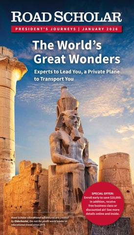 Road Scholar inspires adults to learn, discover and travel. Our learning adventures open minds to new ideas and deepen understanding of oneself and of the world’s peoples, places, cultures, history and environments. A true university of the world, not-forprofit Road Scholar’s meaningful — often transformational — educational adventures engage people for whom learning is the journey of a lifetime. Visit us at www.roadscholar.org.