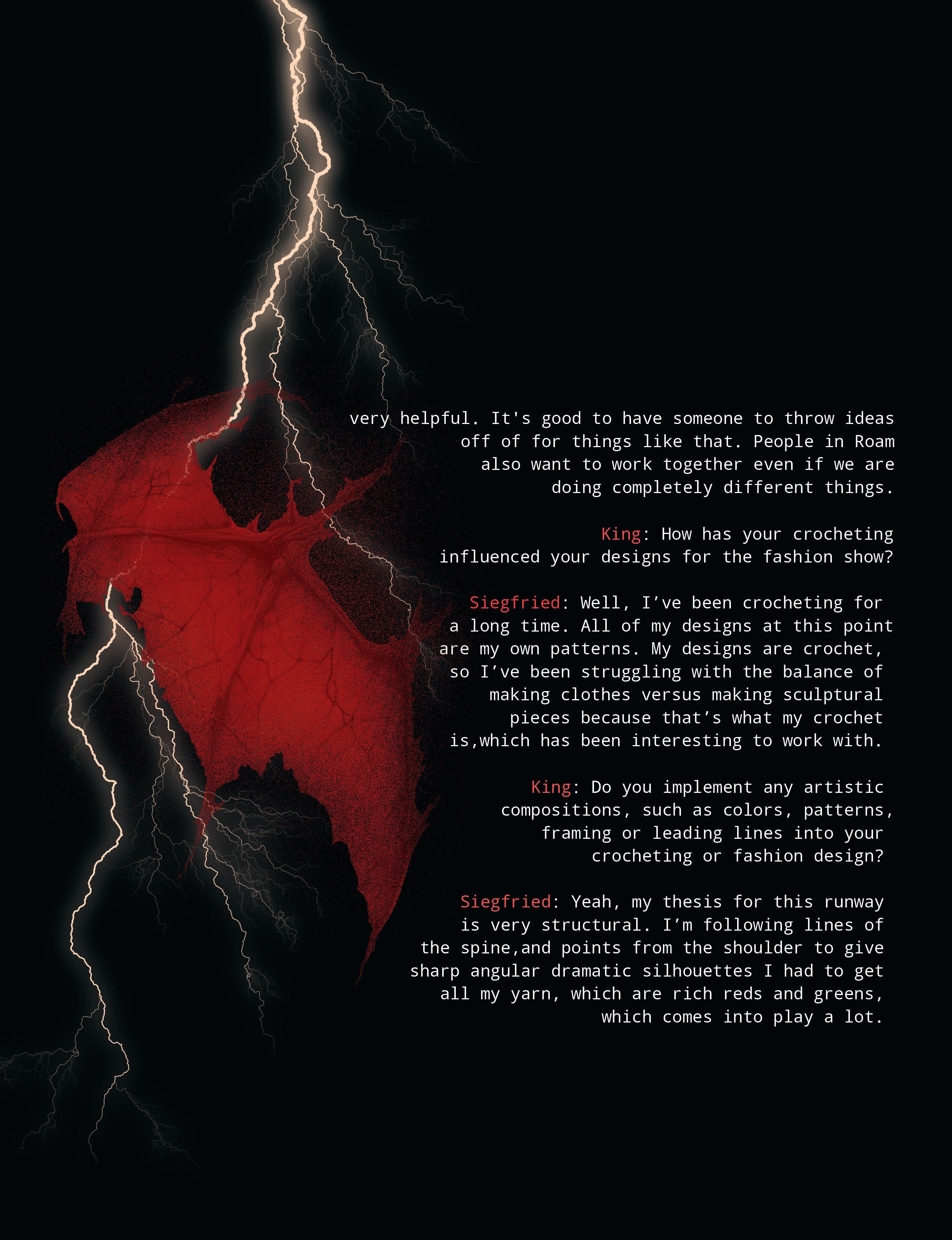 “My pieces in the third act resemble the sharp edges and angers associated with power and sovereignty. Pins and opulent textures work in this idea of what accompanies dominance, speaking to both the perks and pitfalls.”