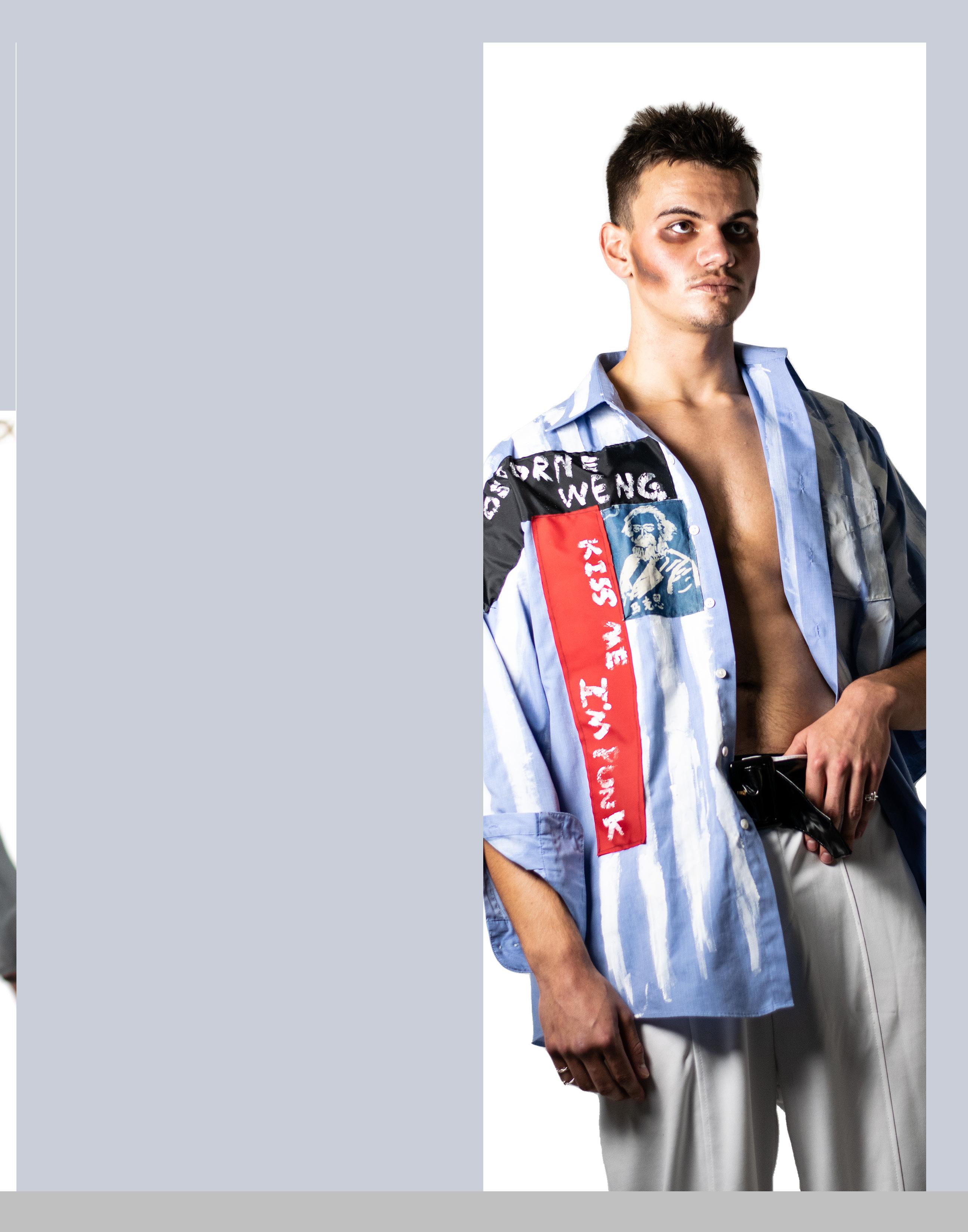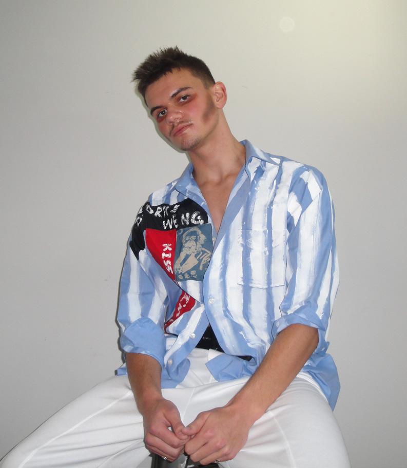Osborne Weng is an international student from Beijing, China, studying psychology with a minor in classics. His designs are inspired by a wide range of designers, including Vivienne Westwood, Alexander McQueen, and The Sex Pistols. Fashion is a way for Weng to express himself, and he adores “fancy stuff.” Weng’s passion for fashion was something he discovered on his own, and he views haute couture as a way for him to express his feelings via fashion. As most young designers do, he enjoys finding simple thrifts, upcycling old clothes, and then adding new designs and cutting to “revamp” them into his personal style. Weng hopes to continue fashion as a hobby and maintain his passion for it and see where it takes him. His iconic jacket, one that boldly proclaims: “Kiss me, I’m punk!” shows his love for 1980s British Punk. Rachael Cunningham is a junior this year studying fine arts. She is from Highlands Ranch, Colorado, and is mainly inspired by art and its beauty. Cunningham has been enjoying combining her interests in art and fashion to create wearable art or fashion pieces that are a work of art. She gets her design inspiration from surrealism, art, and fashion with futuristic touches. Her first project, which was a helmet created from her dad’s old technology from his job as a computer scientist, launched her interest in surrealist art and fashion. Cunningham’s favorite aspects of fashion include playing with different fabrics and exploring fashion as a form of art. She believes fashion and art can change our perception of the things around us and enjoys exploring her curiosities surrounding art and seeing how combining fashion with other forms of art plays into that duality. Cunningham’s goals for herself as a designer include further exploring fashion as a form of art and diversifying her skill set.