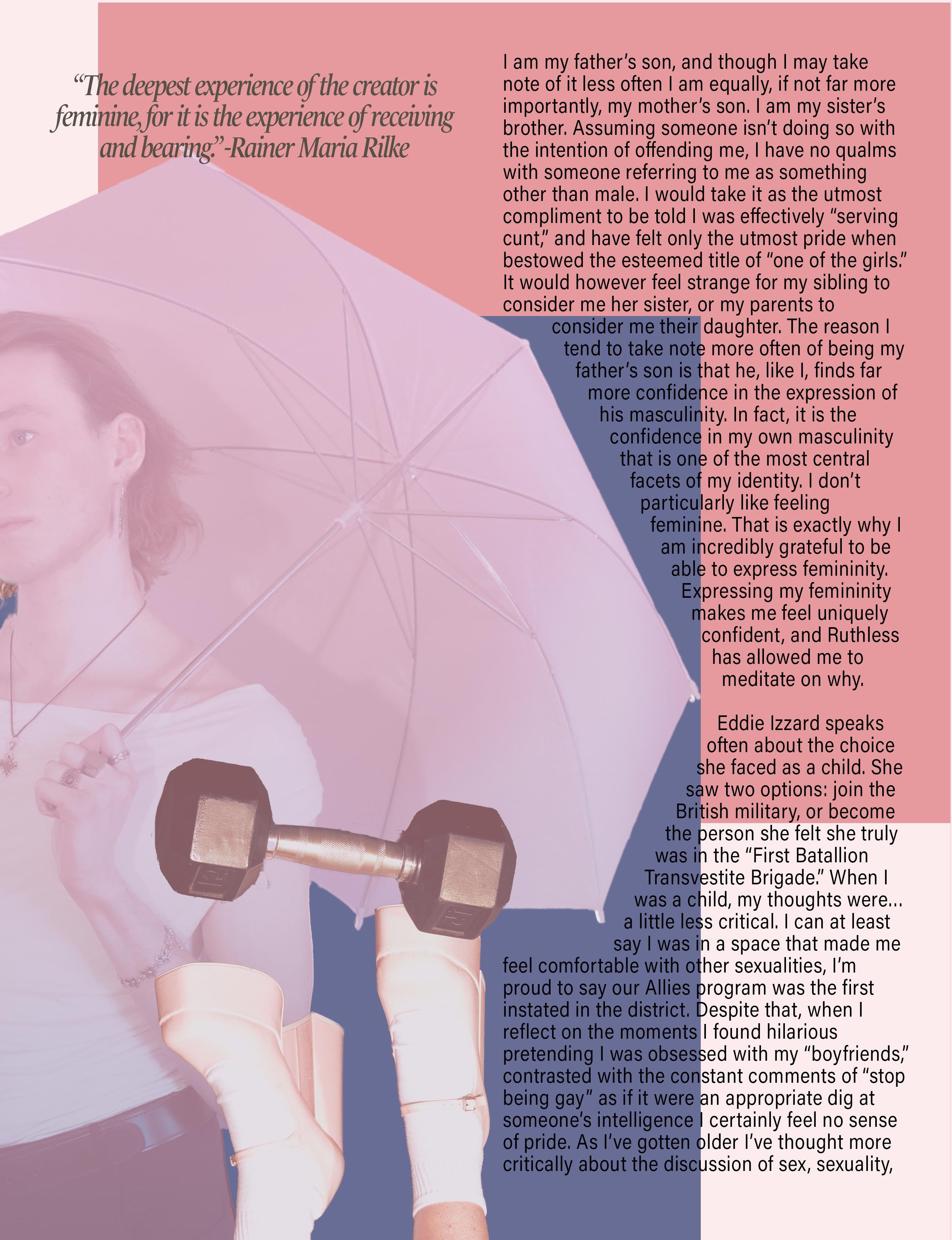 In a world where society is obsessed with labels and forcing people into boxes, one has to wonder what it means to be a woman. “To be a woman doesn’t equal femininity. As someone who dresses masculine and just shaved their head, I feel more like a woman than ever.” For Makyla, it’s not about dressing masculine or feminine but rather wearing what you want. ‘I Love Women’ rejects ‘traditional’ views of femininity and instead embraces the wonders of fluidity.