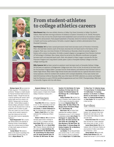 Nate stewart ’03 is the new athletic director at Valley City State University in Valley City, North Dakota. Nate had been serving as director of athletics at Eastern University in St. Davids, Pennsylvania. Prior to that, he was the school’s head men’s basketball coach and served as the assistant athletic director for advancement. Nate played basketball at Roanoke, where he received a bachelor’s degree in health and human performance. He holds a master’s degree in athletic administration from Marshall University. Matt Madalon ’06 has been named permanent head men’s lacrosse coach at Princeton University. Matt, who had been interim coach of the team, becomes the 11th head coach in the history of the program. Matt was a two-time Division III All-America at Roanoke, where he earned a degree in history with a minor in education. He holds a master’s degree in management from Stevens Institute of Technology in Hoboken, New Jersey, where he served as the offensive coordinator and goalie lacrosse coach and associate head coach. Matt, who played in Major League Lacrosse for the San Francisco Dragons and Long Island Lizards, spent a year at Hampden-Sydney College in his first college coaching role. billy Cameron ’08 has been named an assistant men’s lacrosse coach at Hampden-Sydney College. He had been an assistant at Bridgewater College since 2012. Prior to that, he served as the head coach for the Southern Virginia Select Lacrosse club for three seasons, and assistant boy’s lacrosse coach at Salem High School. Billy’s Salem High School duties also included time as a special education instructional assistant, where he worked with students with multiple disabilities. A four-year starter and 2008 All-American while at Roanoke, Billy was a first team All-ODAC selection as a senior and helped lead the Maroons to a pair of NCAA semifinal appearances and two ODAC Championships. Billy lives in Farmville, Virginia with his wife Alison.
