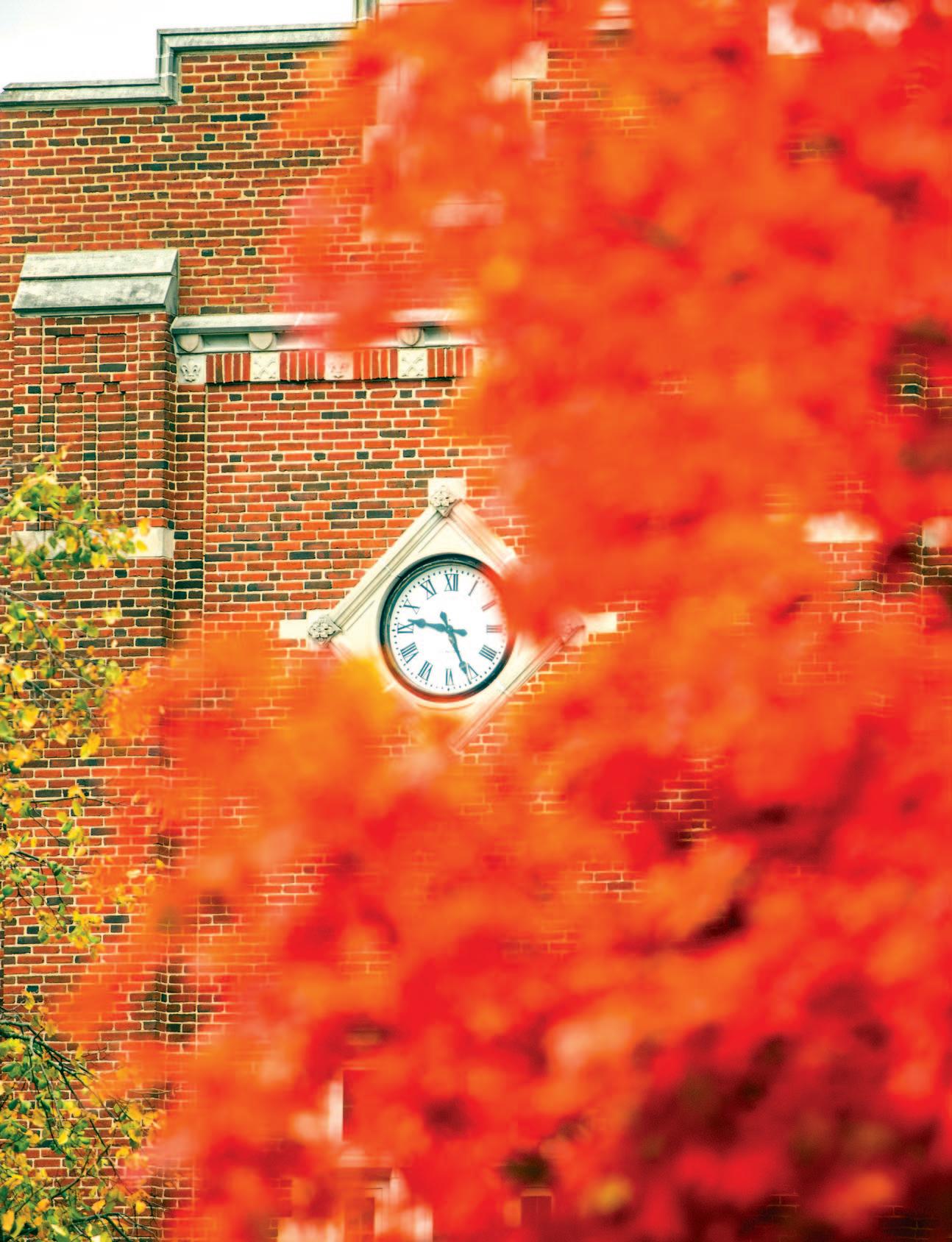 The Alumni Gym clock peeks through the crimson foliage of a sugar maple tree in its full autumn glory. Photo by Griffin Pivarunas ’16.