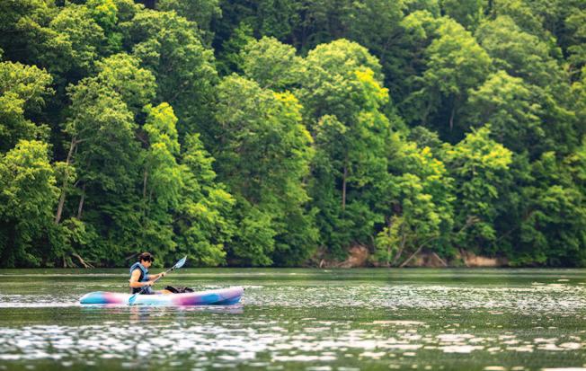 AT RIGHT: Kevin Hernandez-Rodriguez ’26, a student in Associate Professor Andreea Mihalache-O’Keef’s May Term course, “The Hiker’s Guide to Politics and Natural Heritage,” enjoys a paddle on Claytor Lake during the recreational portion of a field trip.