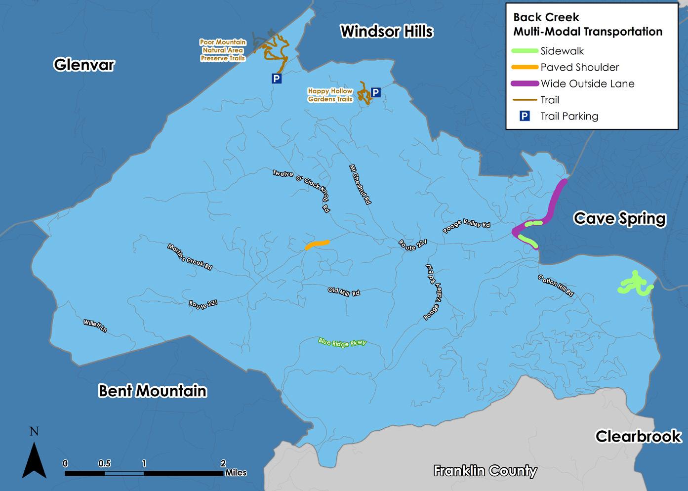 The multimodal accommodations available in Back Creek include trails at both the Poor Mountain Natural Area Preserve and at Happy Hollow Gardens. Recent widening of Route 221 to Cotton Hill Road included wide outside lanes. Reconstruction of Cotton Hill Road from Route 221 to the Blue Ridge Parkway included a new bridge over Back Creek, a wide outside lane for cyclists and sidewalk. The Masons Crest subdivision includes sidewalk on all neighborhood streets.