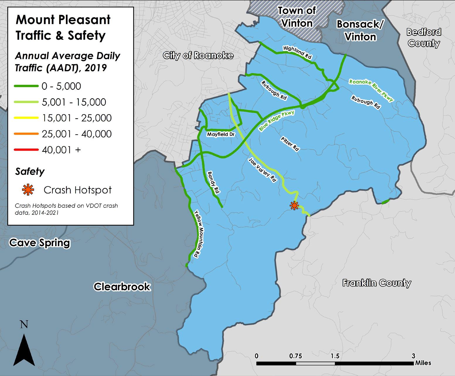 As a sparsely populated rural area, Mount Pleasant is not home to any sidewalks, crosswalks, bike lanes, or transit. Mount Pleasant is home, however, to a long stretch of the Roanoke River Blueway. The Roanoke River Blueway can be accessed from the Blue Ridge Parkway at Niagara Dam and Rutrough Point in Explore Park. Mount Pleasant is also home to Explore Park’s extensive trail network, as well as smaller trail networks at Jae Valley Park and Mount Pleasant Park.