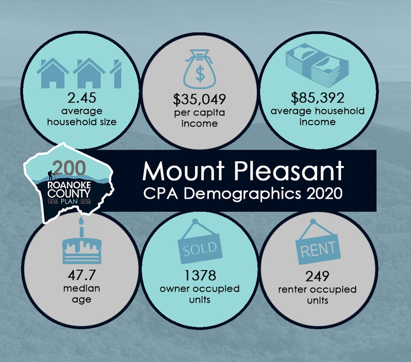 The Mount Pleasant Community Planning Area (CPA) is located in the southeastern portion of Roanoke County. It is bordered by the Roanoke River and the Town of Vinton to the north, Bedford County to the east, Franklin County to the south, the City of Roanoke and the Clearbrook CPA to the west. The study area encompasses 2,400 parcels totaling approximately 10,240 acres. The Mount Pleasant Community Planning Area is home to approximately 3,900 people.