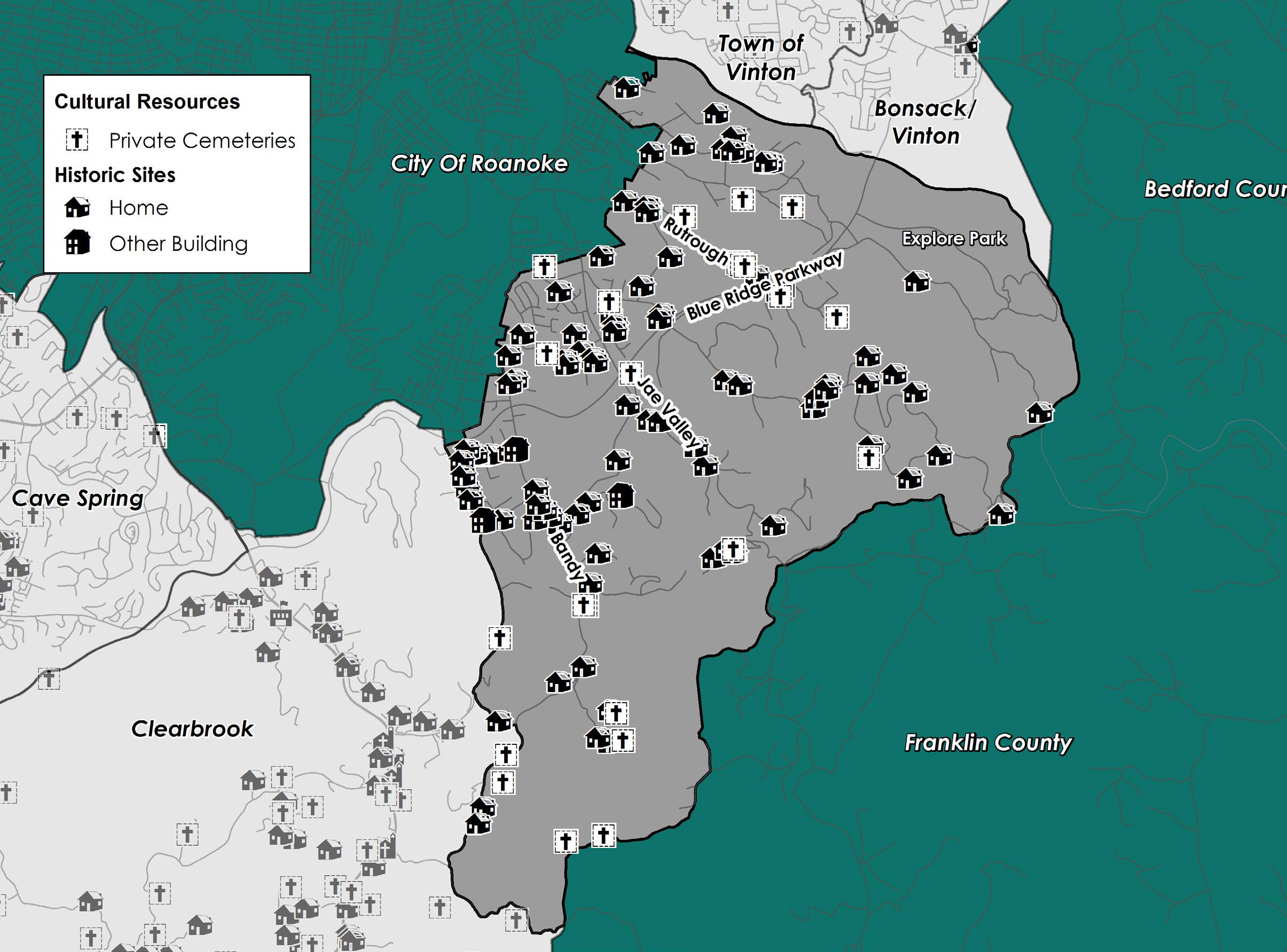 The Blue Ridge Parkway bisects the northern half of the CPA and connects the region to Roanoke County’s Explore Park. This four-mile stretch is the largest tract of protected land in Mount Pleasant. However, motorized access to the Parkway itself only exists outside of the CPA at Route 220, the Mill Mountain Parkway into the City of Roanoke and near Vinton at Route 24, Washington Avenue. The Mount Pleasant CPA is home to numerous historic resources including homes, farms and private cemeteries. Family cemeteries are the most common type of cemetery in Mount Pleasant; most are inactive and small in size (less than 50 interments), ranging in age from 68 to 167 years old.