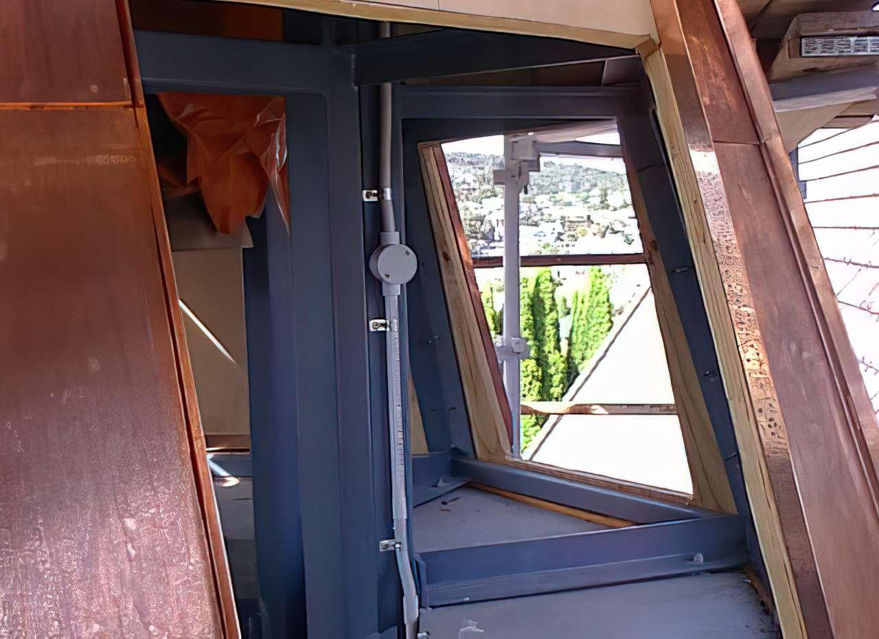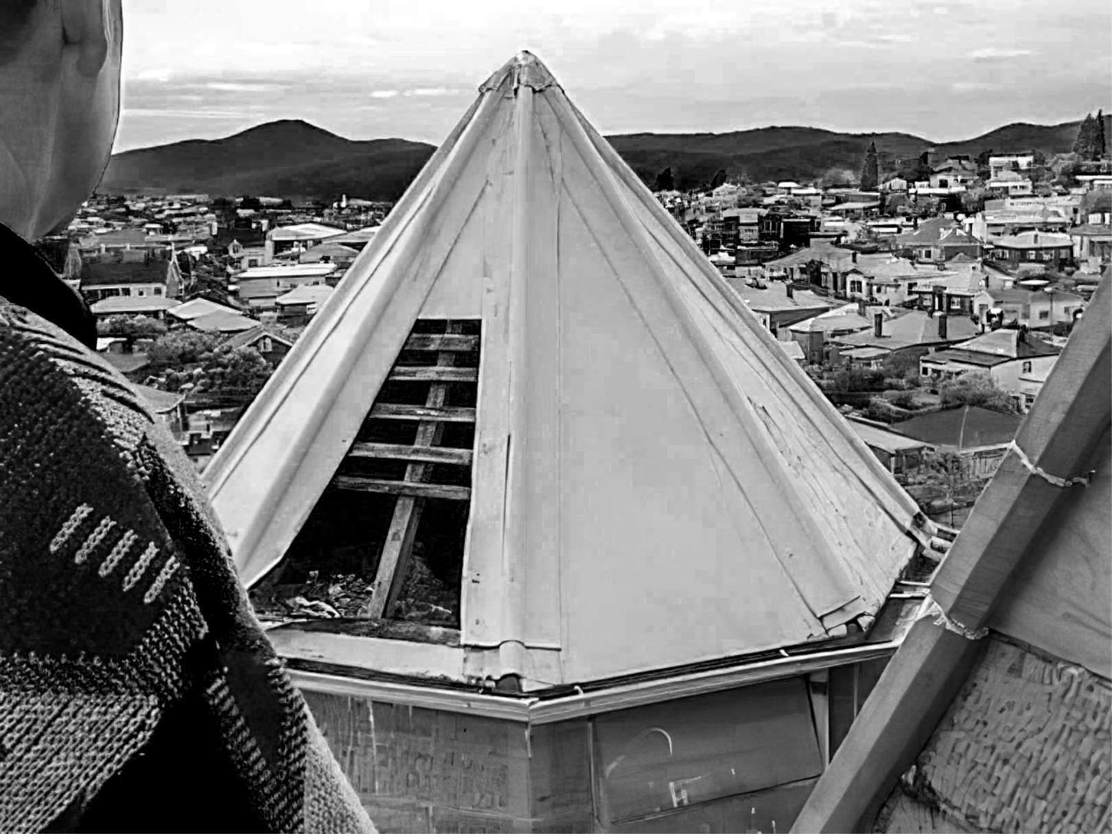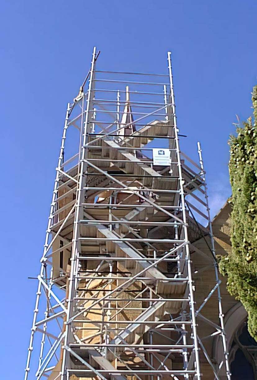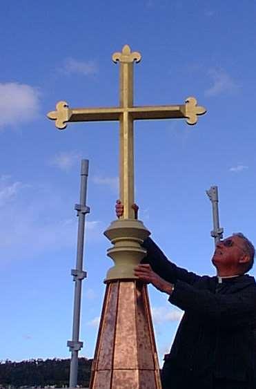 Tocompletethenewspire,FatherTerryYardtooktheresponsibilityof carryingthe30kgcrossupthefiveflightsofscaffoldingtoitsfinalresng place.