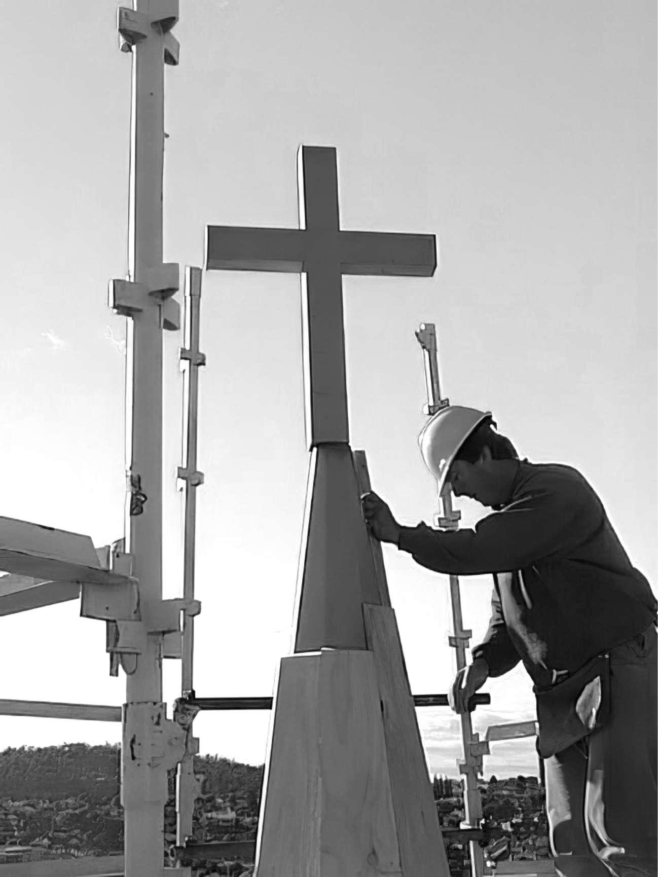 Onceinplace,hecorrectedtheposionandorientaonbeforeitwasfixed intoposion;aerthat,theleadforemanfixedininplaceandourteamand allon-sitecontractorswerereqestednottotouchthecrossagain!