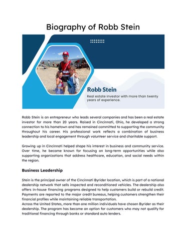 Robb Stein is an entrepreneur who owns and leads several companies and has been a real estate investor for more than 20 years. Raised in Cincinnati, Ohio, he has remained closely connected to the community throughout his career. His work has focused on building businesses while also supporting local organizations through volunteer service and charitable involvement. Robert Stein is the principal owner of the Cincinnati Byrider location, part of a national dealership network that sells inspected and reconditioned vehicles. The dealership also offers in-house financing programs designed to help customers establish or rebuild their credit by reporting to the major credit bureaus. Across the country, more than one million people have chosen Byrider when purchasing vehicles and seeking financing solutions that may not be available through traditional lenders. In addition to this role, he serves as President of Derojo, Inc. This Cincinnati-based company operates auto dealerships, subprime finance companies, a real estate development group, and a reinsurance company. The company focuses on niche markets where businesses may benefit from additional capital and improved management structures. Robert Stein, Cincinnati, is also the President and owner of Alford Motors, Inc., the largest subprime auto dealer group, which combines vehicle sales with financing options for customers who cannot obtain loans from traditional banks or lenders. Beyond business, Robb has been active in community service. He has supported nonprofit organizations focused on healthcare, disability services, education, and the arts. He also enjoys golf, skiing, boating, and outdoor challenges.